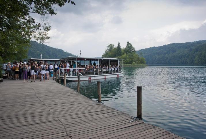 È una coda che appare molto lunga, ma i battelli elettrici sono numerosi e hanno una portata massima di cento persone ciascuno. Arrivano anche a due per volta, dimezzando e riducendo velocemente il lungo serpentone di turisti in attesa. Il tempo è variabile ed una pioggia non è da escludere. Nello salire a bordo, cerchiamo semplicemente di poterci sedere, perchè l'idea di scegliere il posto rimane una semplice chimera irraggiungibile. L'attraversata è assolutamente riposante, lungo tutta la lunghezza del lago, con il battello che scivola sulle acque senza il minimo rumore di motori.